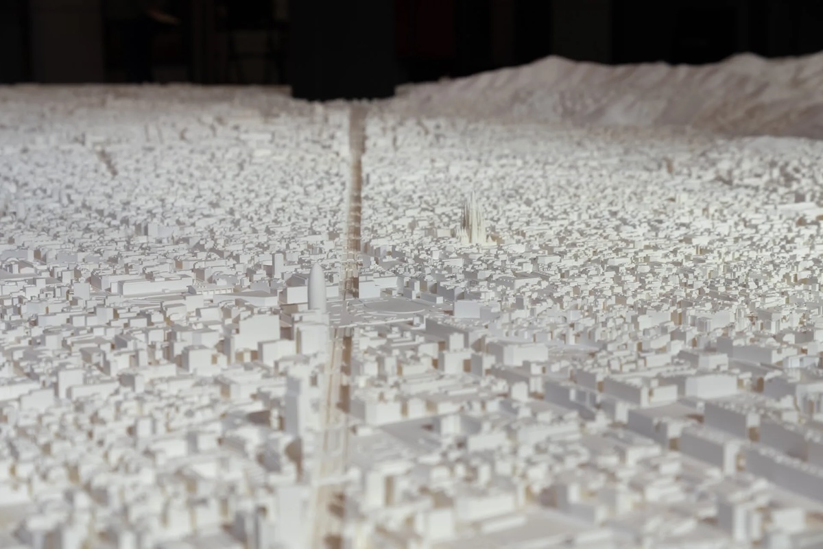 La maqueta, creada per celebrar la Capitalitat Mundial de l’Arquitectura que enguany ostenta Barcelona i exposada fins al desembre a l’antiga seu de l’editorial Gustavo Gili, permet contemplar tota la metròpolis a un sol cop d’ull. A escala 1:1.500, la maqueta desplega aquesta ‘Gran Barcelona’, un territori que s’estén des de Collserola al mar i del Besòs al Llobregat, revelant la seva magnitud. Des de la regularitat de l’Eixample fins als relleus de Montjuïc, i des de les antigues Tres Xemeneies de Sant Adrià de Besòs fins al cor industrial de la Zona Franca; amb carrers, places i artèries principals com l’avinguda Diagonal o l’avinguda Paral·lel que travessen la ciutat.