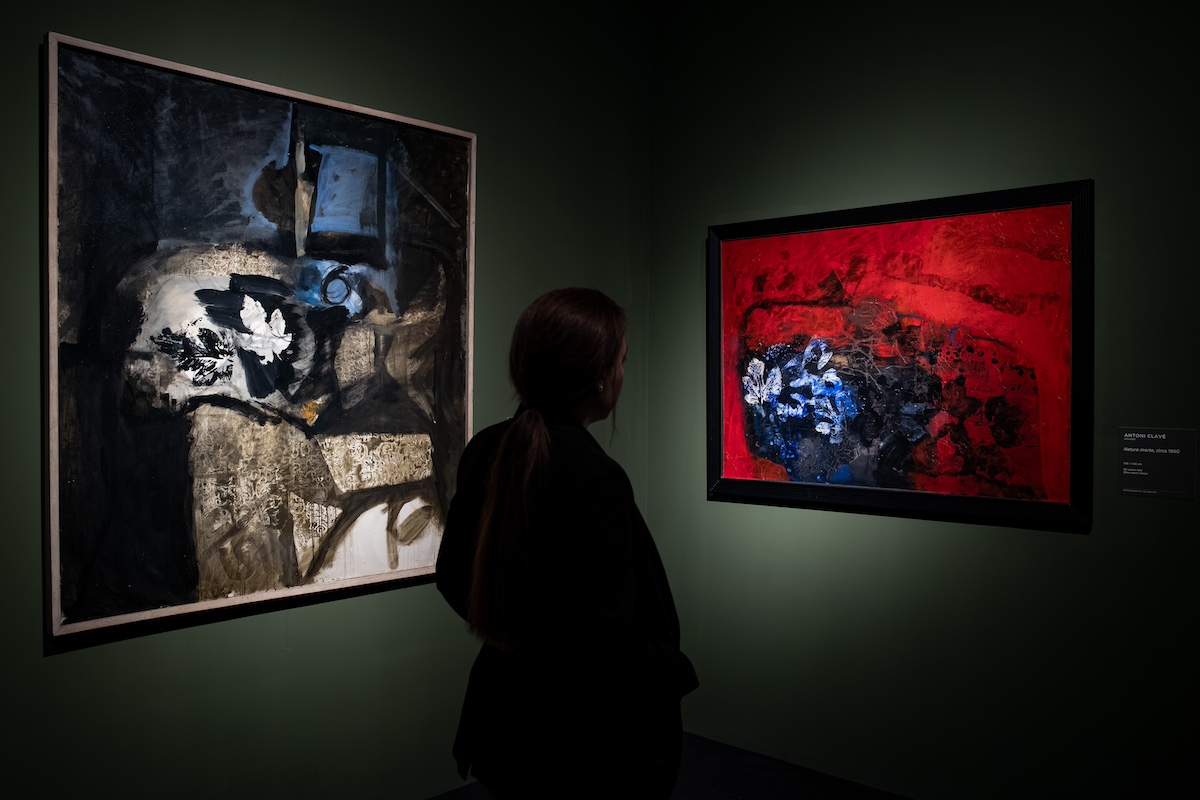 Visitant observant 'Hojas y Tapete' (1964) i 'Nature Morte' (1960), en el Palau Martorell.