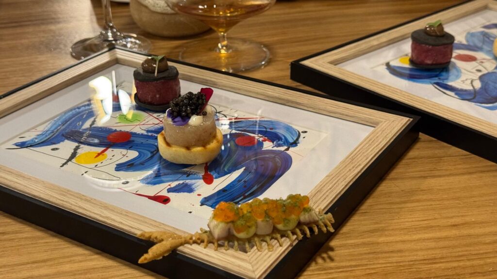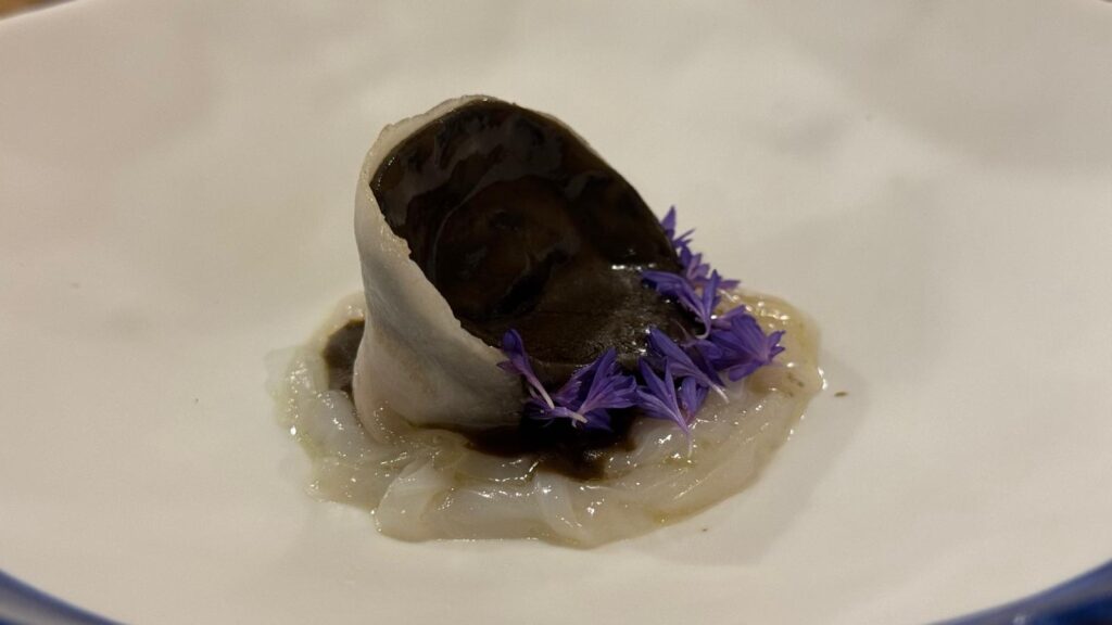 Els entrants calents s’obren amb dos mar i muntanya. Un de manual amb un concepte visual molt atractiu: unes espectaculars tallarines de calamar, ravioli de calamar amb la seva tinta i papada ibèrica a baixa temperatura sobre una base de coliflor. I un altre, de tall més robust, elaborat amb petxines de pelegrí amb un pipil de foie, bolets i tòfona de temporada. En la copa apareix el Julieta 2024 de Josep Foraster, un trepat molt floral, lleuger i ecològic, d’un raïm autòcton de la Conca de Barberà de la qual n’és emblema.