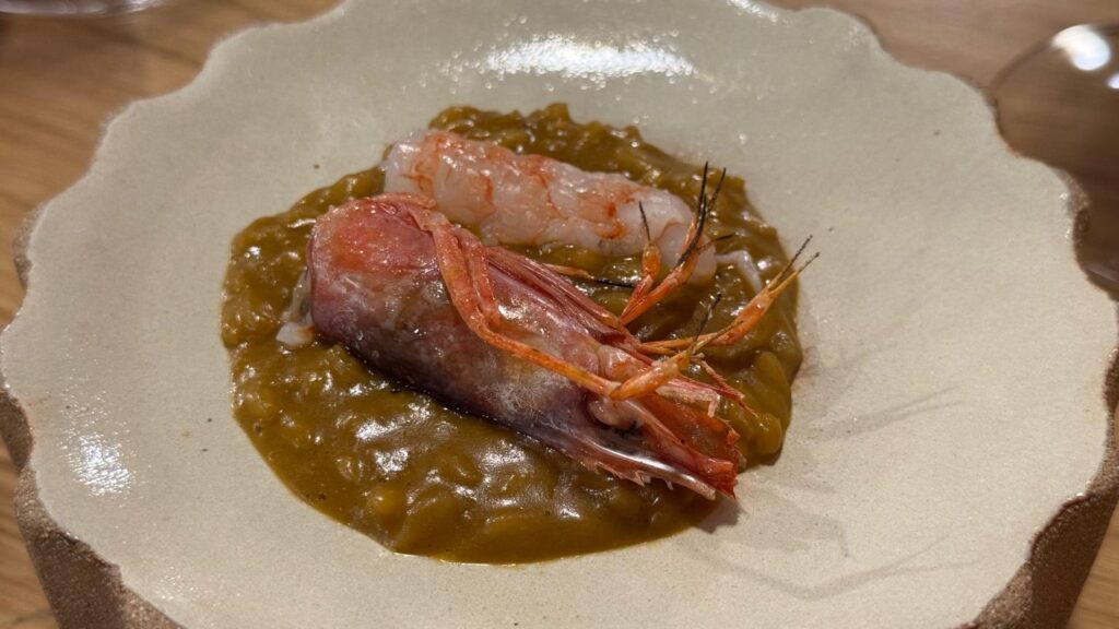 Altres dos plats excel·lents d’El Terrat en els quals per motius obvis no hi ha rastre de patata, tomàquet o pebrot són l’arròs cremós de gamba vermella de Tarragona i el llamàntol blau amb flor de carabassó, mantega torrada, garum i caviar que tanca la part salada.