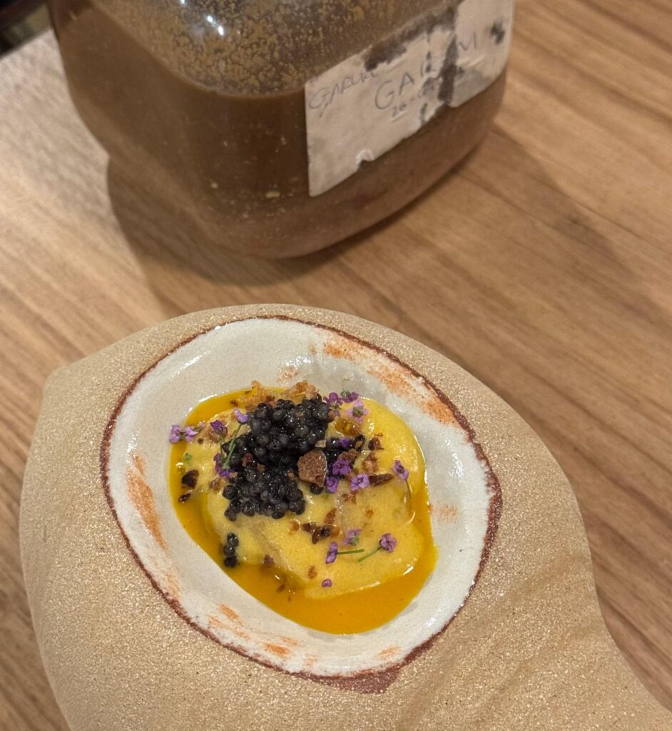 D’Escala Dei, passem a un ancestral elaborat en un poblet de 603 habitants anomenat La Nou de Gaià per Celler 9+ amb xarel·lo vermell: El 3r. És commovedor trobar vins tan buscats i curats en la carta d’aquesta mena de restaurants. És el projecte personal de Moisès Virgili i Rovira, un viticultor apassionat per l’agricultura des de la seva infantesa, que va impulsar la idea d’elaborar vins naturals de mínima intervenció a partir de varietats autòctones procedents de les vinyes pròpies influenciades per la mar Mediterrània. Ens ho explica Núria Vidal, responsable de la selecció dels vins que acompanyen tot el recorregut. El 3r acompanya una crema d’ametlla marcona de Riudoms, gamba blanca, gel d’oliva i aire d’algues; un plat lleuger i elegant. El següent passi, el llobarro marinat en garum, textures de carabassa en escabetx i caviar, puja el discurs i es parapeta com un dels moments més importants. Emplatada en un plat que imita una àmfora romana, una elaboració com aquesta sustenta tot el discurs que també en l’antiga Roma tenien la seva “soia” per a amanir i que val la pena ensenyar-li al client la seva elaboració i reivindicar-la com a pròpia. S’acompanya en copa amb una garnatxa blanca de Batea de 45-60 anys de tall salí.