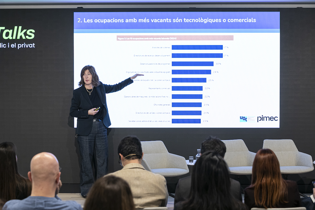 Durant aquesta ponència, Miró i Carme Pagès, directora de la Unitat de Prospecció i Anàlisi Laboral de la Universitat Oberta de Catalunya (UOC), han presentat les principals conclusions del Baròmetre de Competències i Ocupacions de Catalunya —impulsat per Pimec i la UOC—, que radiografia un mercat laboral en constant transformació. Les xifres corroboren la tensió existent: més del 66% de les PIMEs triguen més de tres mesos a cobrir vacants, i en la meitat d’aquests casos el procés pot allargar-se entre sis mesos i un any.
