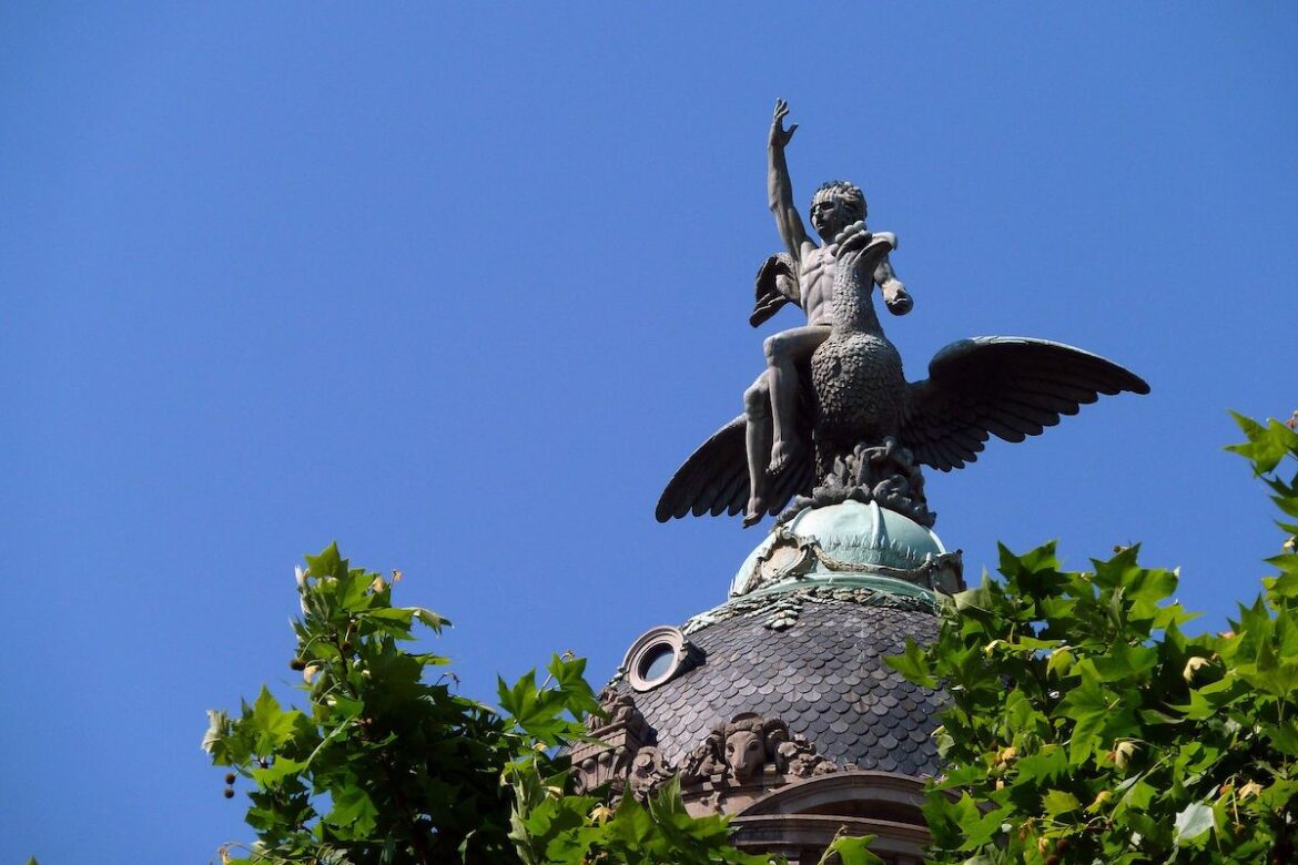 El Fènix, símbol de la companyia, és obra de l’escultor francès Charles René de Saint-Marceaux (polifacètic però tirant a neorenaixentista) i corona l’edifici amb un orgull gairebé olímpic, sempre a punt d’enlairar-se. Amb unes plomes de pedra, que semblen les ales d’una ciutat condemnada a no poder aixecar el vol. A sota, grups escultòrics que evoquen el progrés i la protecció, la llum que combat la desgràcia, la serenitat que venç el caos. Una Barcelona grandiloqüent, però se li perdona perquè no volia quedar antiquada ni atrapada entre fades, flors i cavallers medievals. Barcelona no volia deixar de ser moderna, europea, monumental. Llàstima que les assegurances siguin el tema: la maleïda estabilitat, tan valuosa quan cal, però sempre tan molesta quan toca avançar.