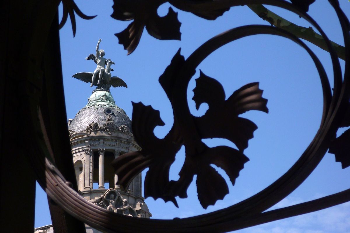 Des de baix, mentre espero que canviï semàfor del “pacificat” Consell de Cent, per primer cop observo la coreografia immòbil de l’edifici. Figures mitològiques, al·legories, cossos clàssics, entre la impudícia (els americans no tenen estàtues nues al carrer, perquè no els va romanitzar ningú: en tot cas les guarden amb clau als museus) i el hieratisme noucentista: de fet una part important surt de les mans d’un escultor tan omnipresent (i alhora elegantment discret) com Frederic Marès, que per molt que intenti ser neoclàssic té el problema d’haver viscut en els anys del noucentisme. El noucentisme mai no podia pretendre emular Roma, o Grècia, perquè és fred i estàtic com una mala cosa. El seu simbolisme obsessiu esdevé gairebé inexpressiu, poc sensual, d’una rigidesa alarmant. I, tot i així, segurament la Barcelona voluptuosa i sensual del Modernisme necessitava segurament una resposta.