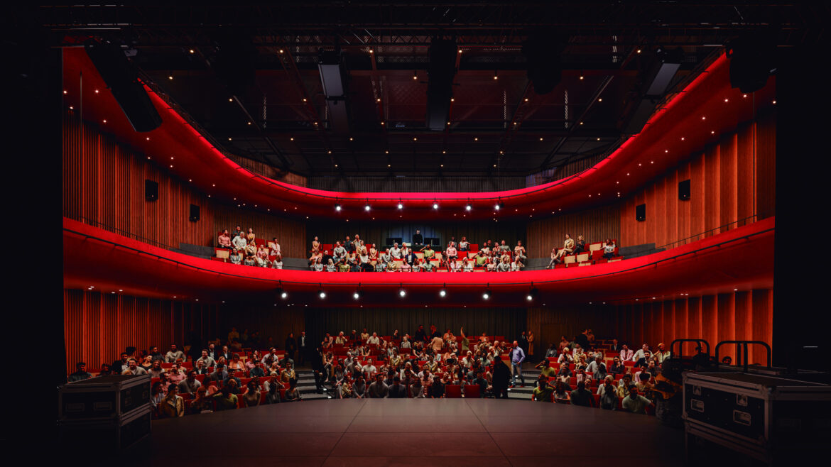 Dos obrers treballen a una bastida, a l’interior d’una nau industrial al Poblenou. I fan soroll amb un martell demolidor. Però un gran batec vermell els fa aturar. És el primer batec de Gènesis i, dins de la nau una cinquantena de persones els observa. Han vingut a celebrar els 40 anys de Focus i a ser testimonis de la presentació d’aquest nou teatre i escola d’arts escèniques que el Grup Focus inaugurarà el 2028, i que aquest dilluns, amb un Nessun dorma cantat a ple pulmó, ja ha estrenat la seva primera funció, entre bastides, balls i una gran maqueta blanca.
