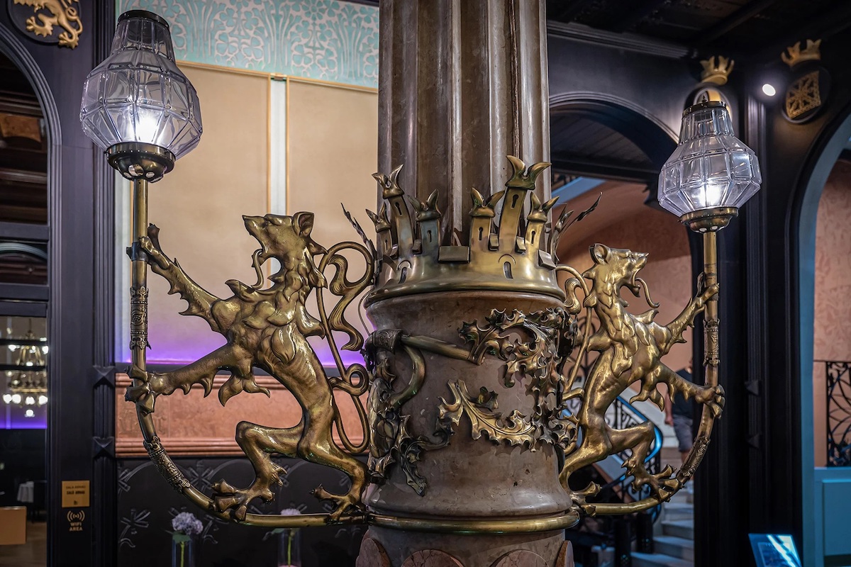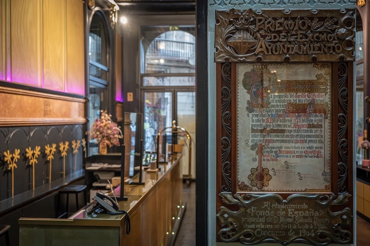 El moment que va atorgar a l’Hotel España la seva veritable rellevància va arribar entre 1898 i 1904, quan Salvadó va encarregar una reforma integral a l’arquitecte Lluís Domènech i Montaner. El resultat va ser una de les intervencions més brillants del modernisme aplicat a l’hoteleria. Domènech va concebre aquí una autèntica obra total, envoltant-se d’artistes com Ramon Casas, autor dels esgrafiats del menjador, i Eusebi Arnau, responsable d’una monumental xemeneia d’alabastre. El 1904, l’Ajuntament de Barcelona va distingir el conjunt amb el premi al millor establiment comercial de l’any, un reconeixement que encara avui es recorda, emmarcat, al vestíbul de l’hotel.