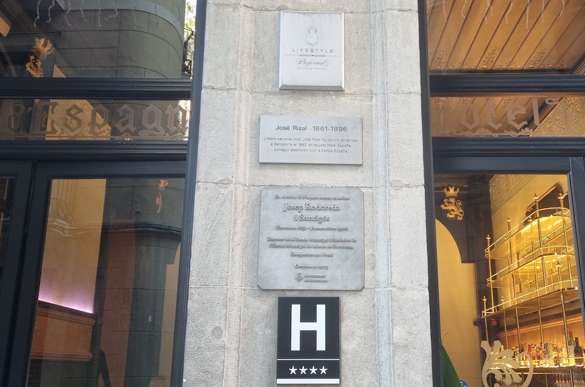 Una altra placa municipal, aquesta vegada a la façana, recorda l’etapa en què l’edifici era casa de veïns: hi va néixer Josep Rodoreda, fundador de l’Escola Municipal de Música de Barcelona i compositor de la música del Virolai, cant dedicat a la Mare de Déu de Montserrat i himne oficiós de Catalunya. Sobre aquesta placa metàl·lica n’hi ha una altra que assenyala que José Rizal es va allotjar a l’España l’any 1882. Aquesta dada explica la singular relació de l’establiment amb Filipines: José Protasio Rizal-Mercado y Alonso-Realonda, destacat maçó, escriptor, oftalmòleg, intel·lectual i primer gran heroi de la independència filipina, va viure aquí durant la seva estada a Barcelona després d’haver estudiat a Madrid.