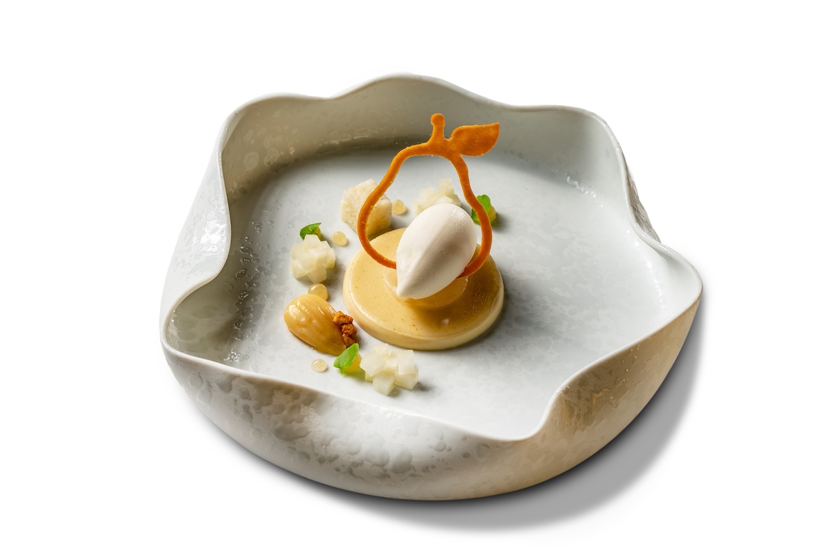 Des d’aquesta atmosfera de contemplació, els plats apareixen com escenes d’un relat fragmentat. Interpretacions de mar, bosc i muntanya es barregen amb receptes que ja són història, com el milfulls de foie amb anguila fumada, que enguany celebra trenta anys. El segueixen reinterpretacions brillants del que aquí ja és cànon, com el tàrtar de calamar de Casagrande. I de sobte, com una subversió subtil i elegant, irromp un croissant amb mantega i caviar. Una joia comestible, delicada i misteriosa, que evoca la textura de la seda i desperta el desig de guardar-ne el secret.