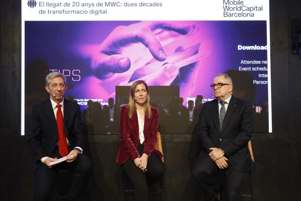 Francesc Fajula, Maria Galindo i Jordi Valls a la presentació de l’informe de la MWCapital durant la primera jornada del MWC 2026 ©  Cedida