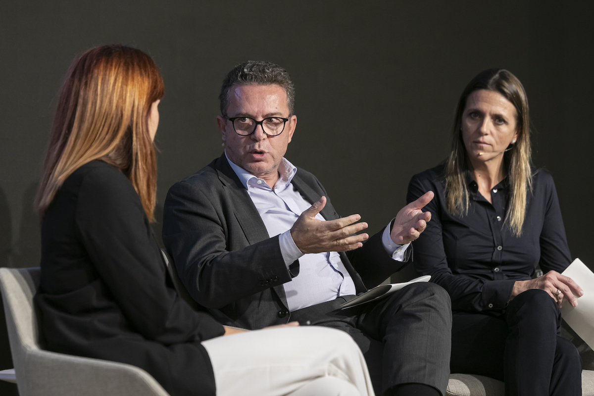 Antoni Vallès, Clara Campàs i Emma Montserrat, urant la sessió 'El repte del finançament empresarial', conduïda per Elena Busquets. © Marc Llibre