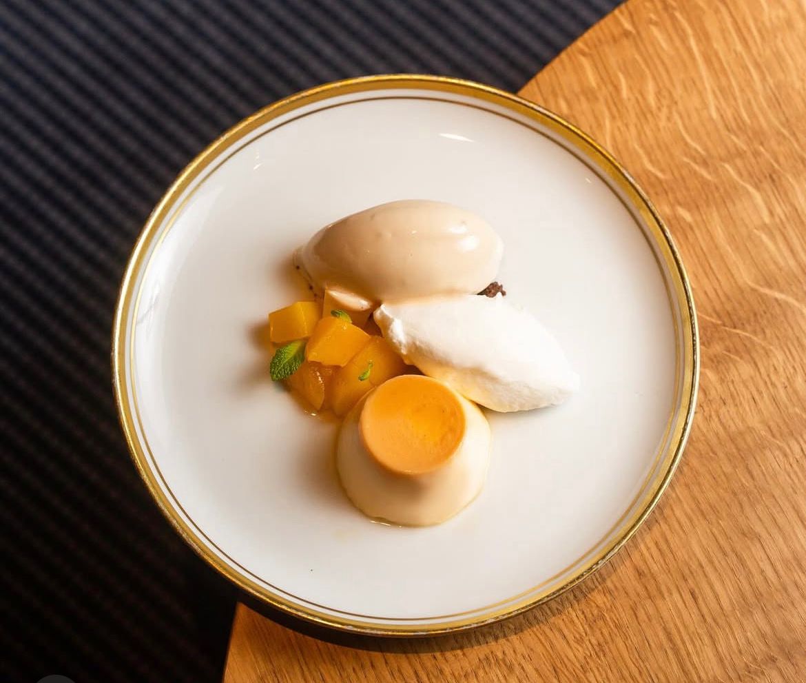 Aquesta picada d’ullet a la cuina local i al passat mariner de la capital catalana arribarà fins a les postres, on el xef ha creat una versió personal del clàssic pijama. Unes postres sorgides gairebé per casualitat, al mític restaurant 7 Portes, arran d’una confusió. Els navegants que atracaven en el port acudien al restaurant i sorprenien els cambrers amb una petició especial per a finalitzar els seus menjars: un pêche melba. Unes postres franceses a base de préssec i gelat creades per a la cantant d’òpera Nellie Melba, que els cambrers locals, aïllats de les modes del moment i amb poc domini del francès, entenien com a ‘pijama’, i al qual, sense saber molt bé què se’ls demanava, oferien a aquests navegants préssec en almívar, nata, guindes, gelat i fins i tot un flam. Una reinterpretació de les postres franceses al qual, de nou, dona la volta Zafra, amb un flam d’ou cremós amb préssec confitat i gelat de banoffee.