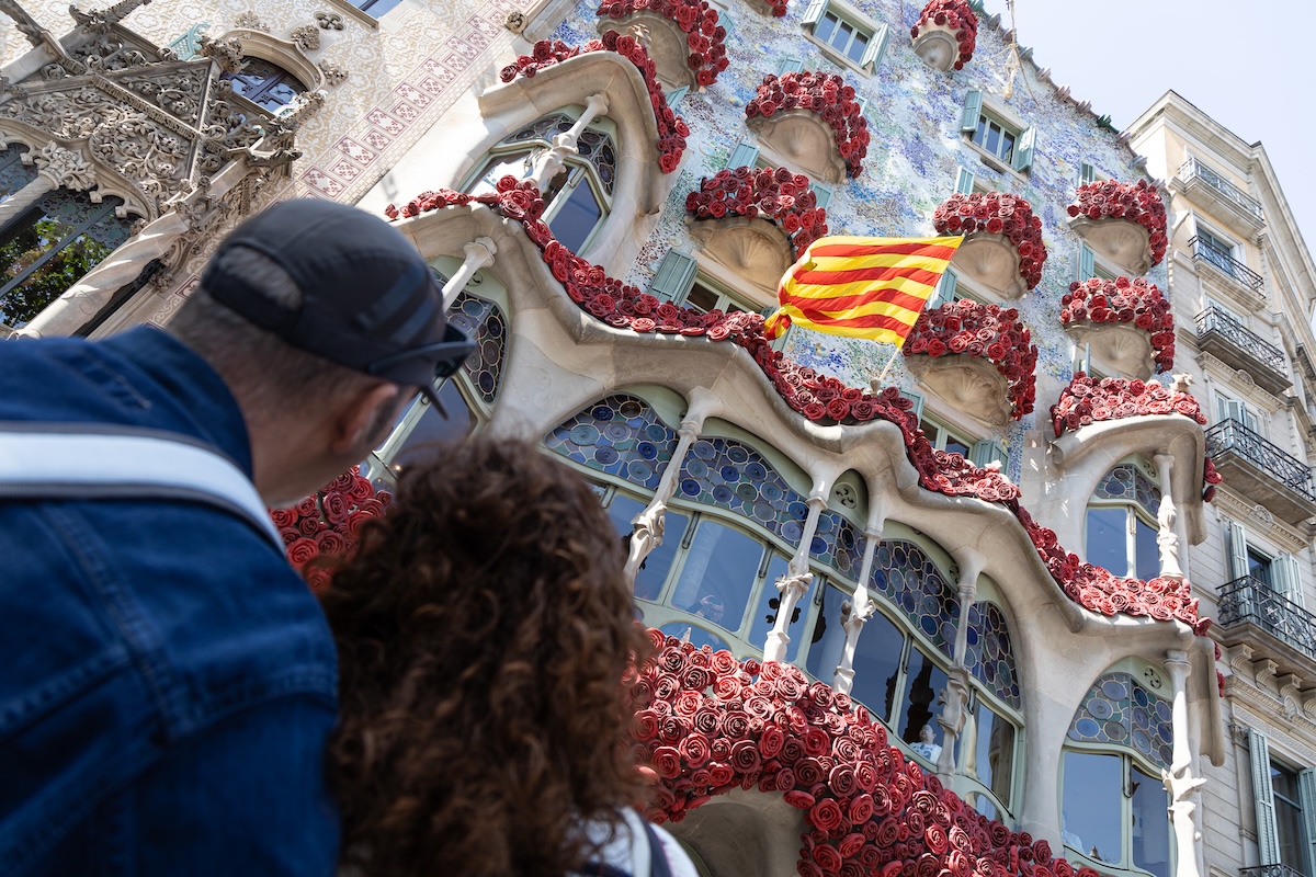Una parella contempla la Casa Batlló, decorada per Sant Jordi. © Àngel Bravo
