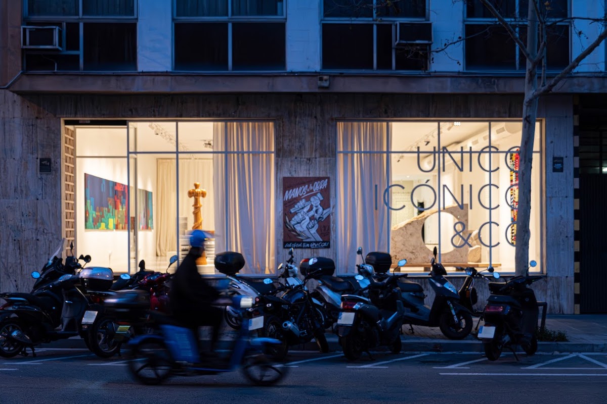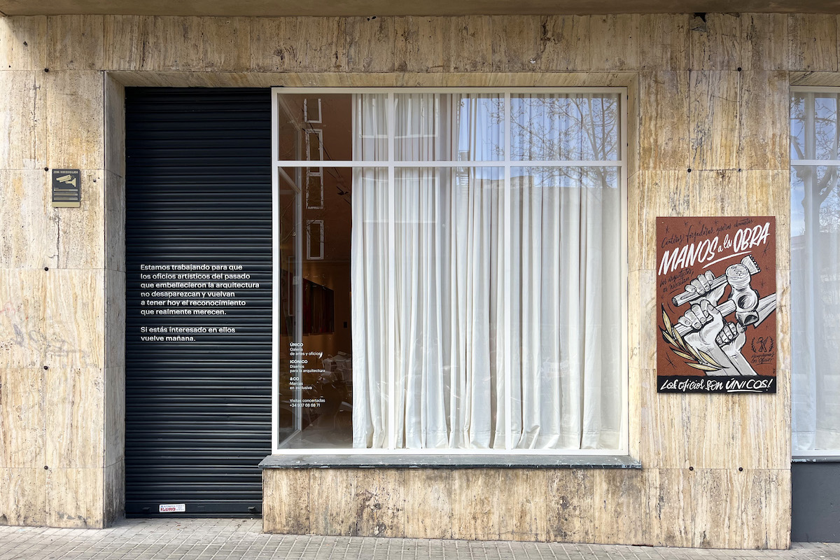 Tot, en un espai diàfan que permet que, des del carrer, s’observin els objectes que amaga aquesta galeria. Flors modernistes, vitralls, portes de fusta, mosaics, forja, pedra, ceràmica o formigó conviuen en aquest espai com a mostra d’una forma de produir artesanalment que, cada vegada més, s’està perdent. Així ho reivindica, també, un cartell propagandístic, creat pel grafista Mr. Zè, penjat a l’exterior d’ÚNICO: “manos a la obra. Los arquitectos os necesitan”.